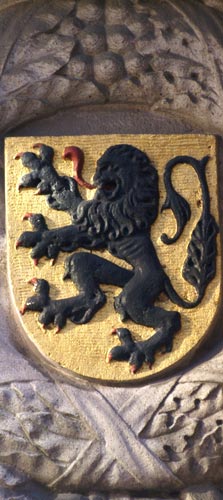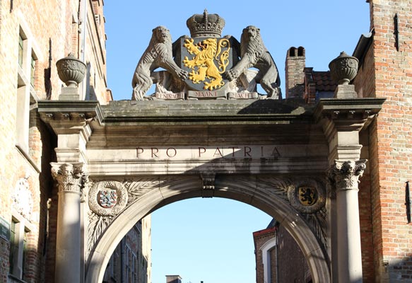In den beiden Bogenzwickeln befinden sich innerhalb runder, mit Stoffbändern umwundener Laubkränze zur Linken das Stadtwappen von Brügge, im siebenmal silbern-rot geteilten Schild ein blauer, rotgezungter und ebenso bewehrter Löwe mit einer goldenen Zackenkrone auf dem Kopf, um den Hals ein goldenes Band mit daran hängendem ebensolchem Kreuz tragend, und zur Rechten das Wappen Flanderns, in Gold ein schwarzer, rot gezungter und ebenso bewehrter Löwe, das alte Wappenmotiv der Grafen von Flandern. Die Flämische Region hat kein eigenes Wappen, aber der Löwe der Grafen von Flandern wurde am 30.3.1988 der Flämischen Gemeinschaft (Vlaamse Gemeenschap, Communauté flamande) zugeteilt, welche die Flämische Region verwaltet.