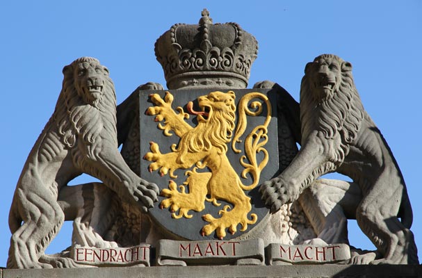 Auf dem oberen Abschluß des Gebälks steht zwischen zwei Vasen das Wappen des belgischen Königreichs, in Schwarz ein goldener, rotbewehrter und ebenso gezungter Löwe (das ist der Löwe des ehemaligen Herzogtums Brabant), auf dem Schild die belgische Krone, zwei Löwen als Schildhalter. Unter dem Staatswappen befindet sich die flämische Devise "EENDRACHT MAAKT MACHT" - deutsch: Einigkeit macht stark oder auch frz. L'union fait la force.
