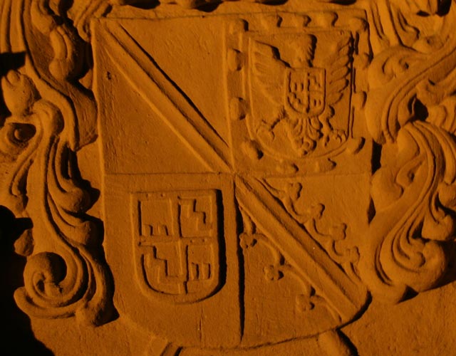 Hinter dem Wappen sieht man ferner schrägrechts den fürstbischöflichen Krummstab und schräglinks das fürstbischöfliche Schwert.