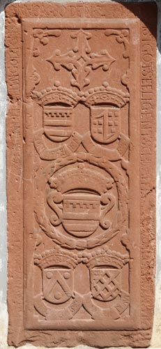 Von den einst vorhandenen Grabplatten hat nur eine einzige aus der Zeit des Barock überlebt, sie ist auf der Südseite der Kirche innerhalb eines vermauerten Portalspitzbogens voller Hochwassermarken in die Außenwand eingelassen. Man hatte sie um 1970 anläßlich einer Fußbodenerneuerung gefunden. Früher müssen viel mehr solcher Platten in der Kirche und im Kreuzgang gewesen sein, denn das Kloster war die Grablege der ortsansässigen Familien. Genannt werden Augustinus, Johann und Ludwig Zandt von Merl, Paulus Boos von Waldeck, Gertrud Stetzgis von Treis, Thomas von Nyne, Philippa von Rinsheim, Katharina von Klaffenburg, Johann Jakob von Ringelberg, Nikolaus und Philipp von Kellenbach, und Friedrich von Kirberg. Alle sind heute spurlos verschwunden bis auf diese eine, welche als Fußbodenplatte überdauerte.