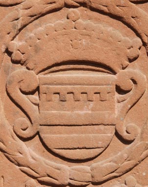 Ein Wappen der Grafen von Daun, ohne passende Inschrift, im oberen Teil unsachgemäß mit einer roten halbrunden Fläche ergänzt.