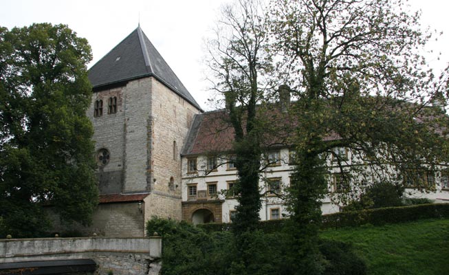 Östlich der Altstadt liegt das Wasserschloß Rheda inmitten weitläufiger Parkanlagen. Die Keimzelle der heutigen Anlage war eine Burg zur Sicherung eines Emsüberganges an einer wichtigen Straße zwischen Münster und Paderborn. Von den Zolleinnahmen an diesem Flußübergang profitierten die Herren der Burg. Die Burg stand nicht direkt im Wasser, sondern auf einer Motte, einer 6 m hohen Anschüttung. Die Burg fiel erst an die Grafen von Tecklenburg, und dann fiel alles zusammen durch Heirat an die Grafen von Bentheim. Das heutige Schloß selbst bildet einen nach Norden offenen Winkel mit wuchtigen Türmen an den Schenkelenden. Der älteste Teil ist der wuchtige Kapellenturm, links im Bild. Die Schloßinsel wird komplett von einem inneren und dazu noch von einem in mehrere Gräften und Teiche aufgelösten zweiten, äußeren Wassergraben umgeben, der vom Fluß gespeist wird und auch die südwestlich gelegene Vorburg mit ihren Wirtschaftsgebäuden einschließt. Eine weitere Gräfte greift um die Gartenanlagen im Westen herum. Eine einzige Brücke gibt von Westen her Zugang zum Schloß. Das Schloß wird privat bewohnt und ist außerhalb von Führungen nicht zu besichtigen. Über dem Portal befindet sich ein Allianzwappen, auf 1719 datiert.