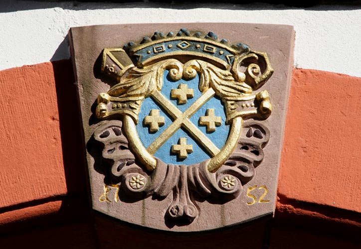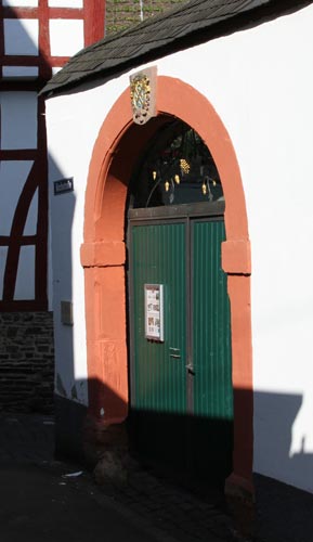 Über dem Torbogen zur Kirchstraße hin befindet sich ein auf 1752 datiertes Wappenrelief für Johann Heinrich von Wassenberg, 1728-1758 zweitletzter und zugleich 30. Abt von Springiersbach, in Blau ein goldener, von vier schwebenden goldenen griechischen Kreuzchen bewinkelter Schragen. Hinter dem von einer hier ebenfalls blau-golden angestrichenen Krone überhöhten Schild ragt schräglinks die Krümme eines Abtsstabes heraus, und auf der anderen Seite ist als Gegenstück eine Inful zu sehen, ebenfalls schräg nach außen gestellt. Das Wappen dieses baufreudigen Abtes begegnet uns noch an mehreren Klosterhöfen der Region, z. B. am Springiersbacher Hof in Pünderich, über dem Hauseingang und mit der Jahreszahl 1741, in schlechter Verfassung und in falschen Farben gefaßt, ferner am Springiersbacher Hof in Merl (Zandtstraße 21 bzw. Hauptstraße 38), datiert auf 1754. Der Wappenstein in Ediger, der aufs Haar dem in Merl gleicht, wurde 2006 originalgetreu restauriert, denn das Wappen war im Zuge der Säkularisierung abgeschlagen worden und bis auf wenige Fragmente zerstört worden, ein Schicksal, das es leider mit vielen Wappen im französisch besetzten Moselland teilte.