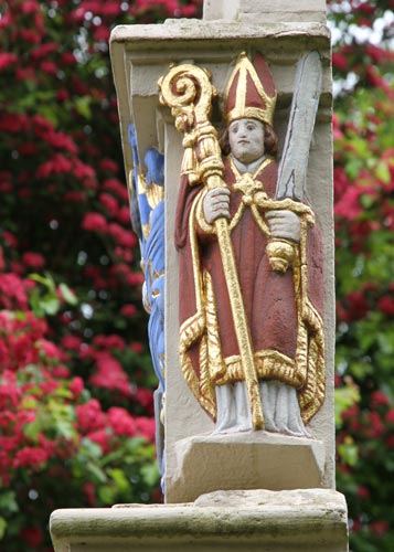 Links und rechts des Wappens sind an den beiden Schmalseiten die Reliefs zweier Heiligenfiguren zu sehen. Gemäß namentlicher Zuordnung auf dem Gesims der Vorderseite handelt es sich um die Figuren der beiden Namenspatrone des Stifters Wolfgang Friedrich von Koppenstein, den "S. WOLFGANGVS" (Abb. oben) mit Bischofsstab, Mitra und Buch (er war Bischof von Regensburg) und den "S. FRIDERICVS" (Abb. unten), wie zuvor, aber mit Schwert in der Linken (er war Bischof von Utrecht und fand den Tod durch ein Schwert).