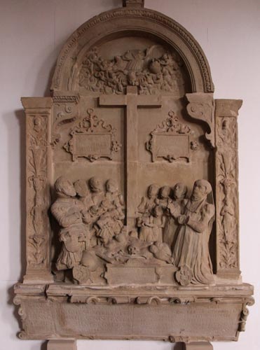 An der nördlichen Seitenwand des Kirchenschiffes befindet sich ein 1575 angefertigtes Epitaph im Stil der Renaissance aus grauem Sandstein für Albrecht von Esch, kurtrierischer Amtmann zu Sehlem, und seine Frau Brigitta von Koppenstein. Albrecht von Esch war selbst nicht Herr zu Esch. Da hingegen Georg von Esch (-1560) auf seiner Platte als Letzter des Stammes bezeichnet wird, war Albrecht von Esch offensichtlich nicht nachfolgeberechtigt (in der Literatur wird er als außerehelicher Sohn bezeichnet). Das im Laufe der Geschichte mehrfach umgesetzte Grabdenkmal, dessen Reliefs erhebliche Beschädigungen der Oberflächen durch Verwitterung und durch Abbrechen von Teilen aufweist, mißt 1,60 m in der Breite und 2,30 m in der Höhe. Besonders reich verziert sind die beiden seitlichen Pilaster, zwischen denen die gesamte Familie mit ihren vielen Kindern rechts und links des zentral aufgestellten Balkenkreuzes (ohne Corpus) dargestellt ist. Oben wird das Epitaph mit einem halbkreisförmigen Aufsatz abgeschlossen.