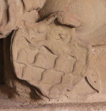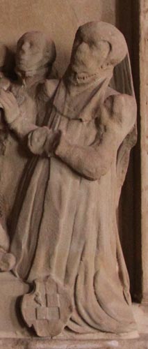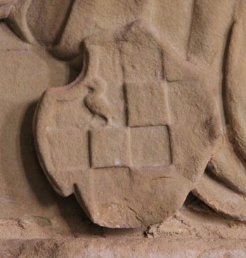 Unter der Darstellung von Albrecht von Esch ist das gewendete Wappen der Herren von Esch angebracht, ein von Gold und silbern-blauem Eisenhutfeh geteilter Schild, oben ein roter Löwe wachsend, und unter der Darstellung von Brigitta von Koppenstein ist das Wappen der Herren von Koppenstein, blau-golden geschacht mit einem roten Freiviertel, darin ein schwarzer Rabe (ausführliche Diskussion beim Koppensteinkreuz in Esch). Beide Reliefs wirken etwas verwaschen und sind an den Rändern abgestoßen, was durch witterungsbedingte Schäden aus der Zeit einer früheren Außenanbringung verursacht wurde.