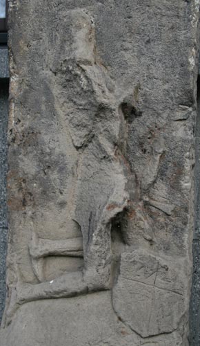 Der untere Teil des Kreuzes ist ein schlanker Sockel von größerer Breite als das Kreuz selbst, und auf ihm sehen wir, wenn auch vom Zahn der Zeit stark angegriffen, die nach heraldisch links gewandte Darstellung einer knienden Ritterfigur mit zum Gebet zusammengelegten Händen. In Kniehöhe befindet sich sein Wappenschild, dieser ist geviert. Es handelt sich um Cuno von Pyrmont und von Ehrenberg (ca. 1375/1380-1447), der mit Margaretha von Schönburg auf Wesel (-1439) verheiratet war. Cuno von Pyrmont und von Ehrenberg war der Sohn von Heinrich IV. von Pyrmont und dessen Frau Katharina von Gronsfeld. Seine Großeltern väterlicherseits waren Cuno von Pyrmont (erw. 1330-1351) und Lisa von Lösnich (-7.9.1399), und seine Großeltern mütterlicherseits waren Heinrich von Gronsfeld und dessen Frau Mechthild von dem Bongart zur Heyden. Über der Ritterfigur befinden sich zwei Wappenschilde, und darüber ist die Bildhauerarbeit in gotischen Minuskeln datiert: "anno d(o)m(ini) mccccxlvi" - im Jahre des Herrn 1446. Es ist also 1 Jahr vor dem Ableben des Dargestellten angefertigt worden. Damit endet der Sockel, und darüber erhebt sich das Kreuz mit drei kleeblattförmigen Balkenenden, wobei auf den beiden seitlichen Kleeblattenden zwei weitere Wappenschilde zu sehen sind, die mit den beiden unteren eine 4er-Ahnenprobe des dargestellten Ritters bilden.