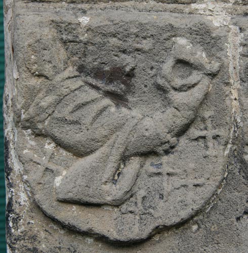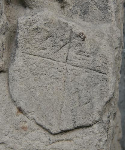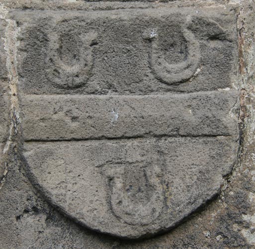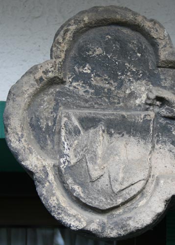 Gleich neben diesem Wappen befindet sich der Schild für die Großmutter mütterlicherseits, Mechthild von dem Bongart zur Heyden, Tochter von Arnold von dem Bongart Herr zur Heyden, Kastellan und Drost zu Herzogenrath. Der Schild zeigt in Silber einen schwarzen Balken zwischen drei (2:1) mit den Stollen nach oben gelegten, roten Hufeisen. In der Literatur wird dieses Motiv als Kesselbügel gesehen und dargestellt, hier erinnern jedoch die unten verdickte Form und die Löcher im Material viel eher an Hufeisen mit den Aussparungen für die Hufnägel. Die hier nicht abgebildete Helmzier wäre zu schwarz-silbernen Decken ein wachsender, silberner Brackenrumpf, der mit dem Schildbild belegt ist. Das Wappen wird beschrieben im Zobel Tafel 41 sowie im Rietstap (d'argent à la fasce de sable, accompagné de trois cornières de gueules, cimier: un chien issant aux armes de l'écu ou un demi-vol de sable, semé de feuilles de nénuphar d'or) und im Rolland, dort mit den Öffnungen nach unten gezeichnet.