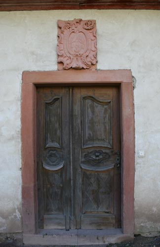 Unter dem mittig in der Fassade über der Tür angebrachten Wappenstein ist eine Initialkartusche angebracht, welche die verschränkten Initialen AW für Adolph Werner zeigt. Die umlaufende Inschrift trägt nur die Devise dieses Abtes: "SUAVITER ET FORTITER". Um das Inschriftenband liegt ein üppiger Rokoko-Rahmen; oben sind Inful und Krummstab zu sehen. Das Wappen folgt der zuvor gegebenen Beschreibung, auch hier ähneln die beiden äußeren Tierköpfe Löwenköpfen.