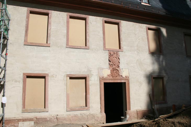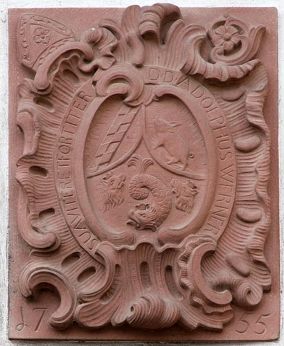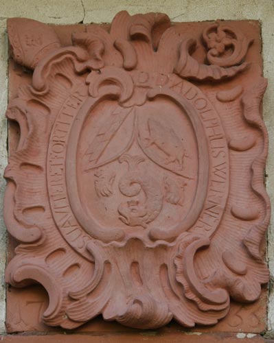 Der auf das Jahr 1755 datierte Wappenstein befindet sich über einer Tür an der nordöstlichen Längsseite des Gebäudes. Die umlaufende Inschrift lautet: "D(OMINUS), D(OMINUS ADOLPHUS WERNER SUAVITER ET FORTITER". Um das Inschriftenband liegt ein üppiger Rokoko-Rahmen, neben dem Inful und Krummstab fast unscheinbar wirken. Das Wappen folgt der zuvor gegebenen Beschreibung, aber die beiden äußeren Tierköpfe neben dem verschlungenen Fisch bzw. Delphin wirken hier eher wie Löwenköpfe mit herabhängendem Halsfell.