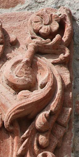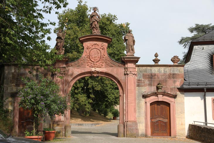 Im Scheitel des großen Bogens befindet sich die Rokoko-Kartusche mit der Datierung des Torbogens auf A(NNO) D(OMINI) MDCCLXXIV (= 1774). Das Tor wurde von Steinmetz Anton Süß und dem Bildhauer Nikolaus Binterim aus Mainz errichtet. Es handelt sich um das letzte Bauwerk der Mönche vor der Säkularisation.