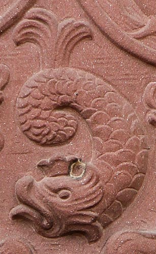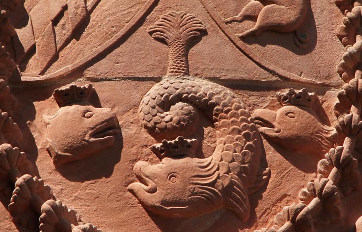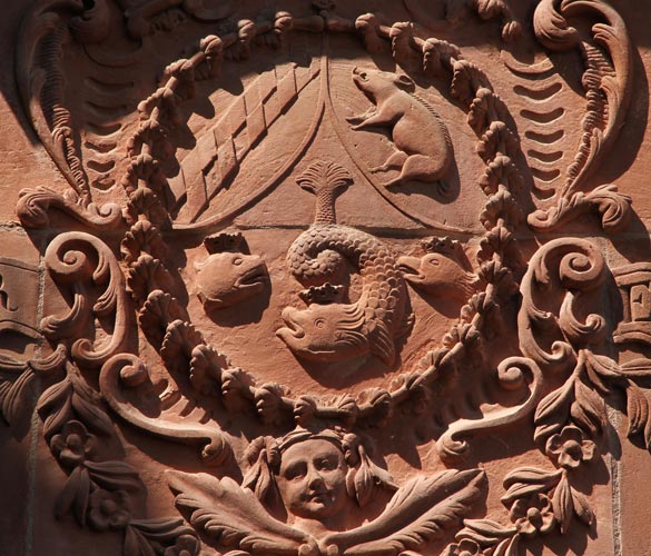 Dieses zeigt in der Mitte einen gekrönten, mit dem Leib nach oben entgegen dem Uhrzeigersinn gekrümmten und seinen pfahlweise nach oben gerichteten Schwanz einmal überkreuzenden Fisch oder Delphin zwischen zwei einwärts gerichteten, gekrönten Tierköpfen, die hier rechts einem Fischkopf und links einem Adlerkopf ähneln, in anderen Darstellungen jedoch eher Löwenköpfen ähnlich sehen. Die Identität dieser Tierköpfe läßt sich anhand des widersprüchlichen Materials nicht eindeutig klären, da hier jedoch der künstlerisch und handwerklich beste Wappenstein zu sehen ist, dürfte man hier wohl die genaueste Darstellung erwarten.