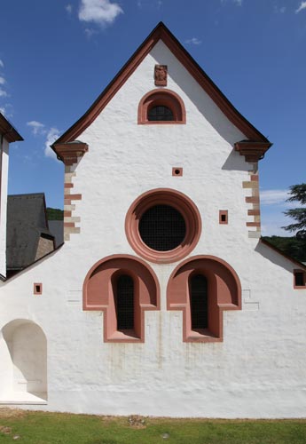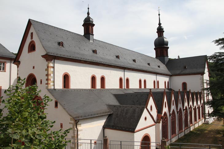 Die 80 m lange und um 1140 begonnene Klosterkirche beherrscht wie ein mächtiger Querriegel das Tal und reicht vom Westhang bis an den Kisselbach. Heute ist die Basilika von den barocken Zutaten befreit und strahlt in ihrer Architektur wieder zisterziensische Strenge aus, mit schmucklosen, klaren Formen, mit monumentalen, nur mit kleinen Rundbogenfenstern durchbrochenen Wandflächen und harten Begrenzungen, die der Askese und kompromißlosen Strenge des Reformordens entspricht (zumindest derjenigen der Frühzeit). Die im gebundenen System geplante romanische Basilika wurde nach zwei Bauphasen, zwischen denen sich ein Konzeptwechsel vom Quaderbau zum Bruchsteinbau vollzog, 1186 durch den Mainzer Erzbischof Konrad von Wittelsbach geweiht. Eine nächste Bauphase fand in der Gotik statt, in dieser Zeit entstanden die neun gleichartig gestalteten Kapellen aus der ersten Hälfte des 14. Jh. am südlichen Seitenschiff, weit schmuckfreudiger als der bisherige Baukörper, und sie verleihen mit ihren spitzen, hintereinander gereihten Dächern und ihrem phantasiereichen Maßwerk der Südfenster dem Baukomplex einen wirkungsvollen Rhythmus aufwendigerer und schmuckfreudigerer Gestaltung. Es handelte sich eigentlich um gestiftete Grabkapellen. Die ältesten Kapellen liegen im Westen, und beim Gang nach Osten kann man nachvollziehen, wie das Maßwerk immer formenfreudiger, reicher und zartgliedriger wird. Schließlich griff der Wille zur gotischen Veränderung auch auf den bestehenden Bau über, und im Chor wurden Maßwerkfenster eingebaut. Die nächste die Basilika wesentlich verändernde und prägende Zeit war der Barock. Alle Dächer und Dachreiter wurden nach Sturmschäden 1746 ff. erneuert, und es wurde ein steilerer Winkel gewählt, der zu den gotischen Kapellen paßt. Das Maßwerk der gotischen Chorfenster wurde zerstört, als ein neuer, barocker Hochaltar eingebaut wurde. Einige der großen gotischen Fenster im Chor wurden vermauert, dagegen wurden die Langhausfenster 1707 vergrößert. Die südlich angebauten Kapellen faßte man paarweise unter jeweils einem neuen, flacheren Dach zusammen, außerdem wurden die Fenster verändert. 1708-10 wurde der Mönchsbereich im Chor (Vierung, Chorhaus und Chor) höhergelegt und mit einer hohen Chorschranke vom Langhaus abgetrennt, durch die drei Portale von Meister Valentin Müller führten, der auch die Portale am Konversenbau gestaltete.