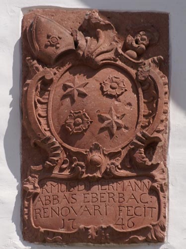 Ein weiteres Mal begegnet dem Besucher das Wappen dieses Abtes am Westgiebel der Klosterkirche, ganz oben über dem halbrunden, obersten Fenster. Hier haben die Rosen auch die übliche Form mit fünf Blütenblättern und ebenso vielen Kelchblättern dazwischen. Der Wappenstein ist auf das Jahr 1746 datiert und trägt die Inschrift "R(EVERENDISSI)MUS D(OMINUS) HERMANN(US) ABBAS EBERBAC(ENSIS) RENOVARI FECIT".