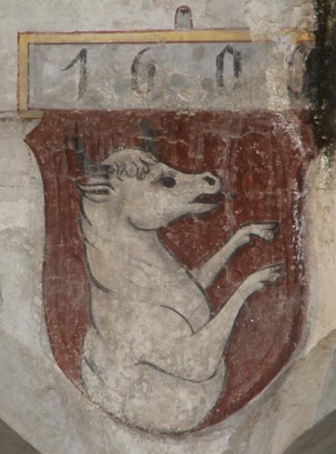 Zwei Wappen sind am auf drei abgetreppten Kragsteinen ruhenden Erker zu sehen: Unterhalb des Fensters des ersten Obergeschosses befindet sich ein auf 1600 datiertes Fresko eines Wappenschildes der Familie von Söll (oder Sell), in Rot ein silberner, hier linksgewendeter, aus dem Schildfuß wachsender oberhalber Stier mit schwarzen Hörnern. Die hier nicht dargestellte Helmzier wäre zur rot-silbernen Decken die Schildfigur wachsend. Diese vom Amserhof zu Wielenbach bei Bruneck stammende Familie ist ein tief in der Geschichte der Stadt Bruneck verwurzeltes Geschlecht, das bereits 1375 mit Heinrich der Sell, auch Amser genannt, nachweisbar ist. Seine beiden Söhne, Lienhart und Erasmus, wurden zu Stammvätern zweier Hauptlinien, der Linie der hier relevanten Ochsen-Söll und der Linie der Aichel-Söll. Die Familie stellte im Laufe der Zeit in Bruneck sechs Stadtrichter, drei Oberamtspfleger und vier Schloßhauptmänner sowie vierundzwanzig Bürgermeister im Zeitraum von 1426 bis 1609.