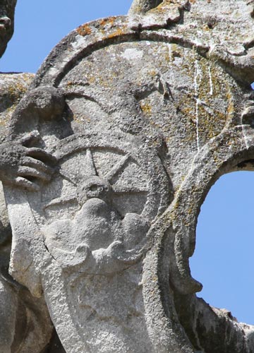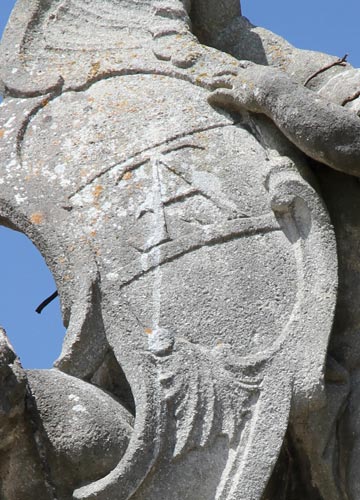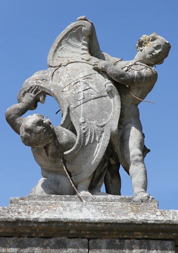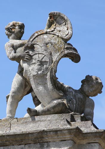 Das Wappen über dem optisch linken Pfeiler (Abb. unten, mit Ausschnittsvergrößerung) ist das von Nikolaus Graf Pálffy von Erdöd (4.9.1710-6.2.1773), Sproß einer ungarischen Adelsfamilie, die 1383 erstmals urkundlich erwähnt wird. Diese Familie führt in Blau aus einem grünen Dreiberg wachsend ein goldenes Wagenrad, aus dem ein goldener Hirsch wächst. Die hier nicht dargestellte Helmzier wäre zu blau-goldenen Decken der goldene Hirsch wachsend. Das Wappen wird beschrieben im Siebmacher Band: FstB Seite: 32 Tafel: 60-61, Band: Mä Seite: 95 Tafel: 74, Band: SchlA2 Seite: 88 Tafel: 56, Band: Bö Seite: 155 Tafel: 71, Band: Kro Seite: 138-139 Tafel: 100, Band: Un Seite: 474 Tafel: 347-348, Band: NÖ1 Seite: 327 Tafel: 175 sowie im Band: Sibü Seite: 281 Tafel: 209.