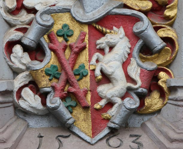 An der Fassade ist das Wappen der Familie Steitz von 1563 angebracht. Bis 1547 führte die Familie ein einfaches Hausmarkenwappen, mit welchem Johann Steitz auch siegelte. Es handelte sich um zwei schräggekreuzte Schäfte, wobei jeder freie Schenkel eine Halbsprosse trägt, am rechten oberen Schenkel schräglinks nach unten, am linken oberen Schenkel schrägrechts nach unten, am rechten unteren Schenkel schrägrechts nach oben und am linken unteren Schenkel schräglinks nach oben.