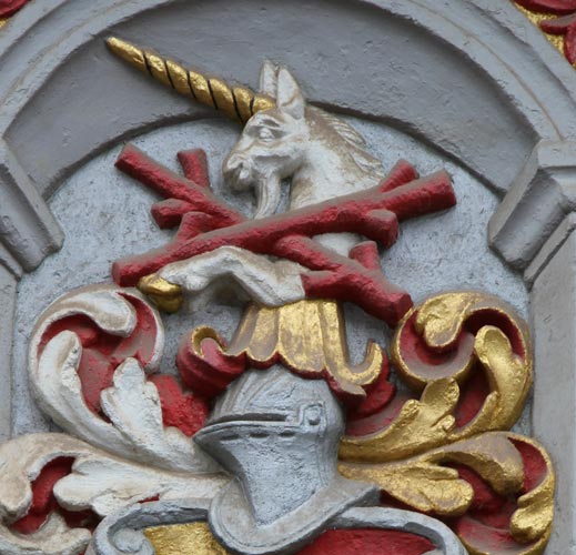 Zur Vollständigkeit werden hier noch die Wappen beider Ehepartner des Bauherrn angegeben: Seine erste Frau, Anna Warnberger (vor 1540-5.10.1574) führte eine auf einem Dreiberg sitzende, hersehende Eule, was ein redendes Wappen ist: Die Eule sitzt als warnender Vogel auf einem Berg. Seine zweite Frau, Anna Zielfelder, führte im Schild und als Helmzier den Fuß eines Adlers, die Fänge nach oben gerichtet.