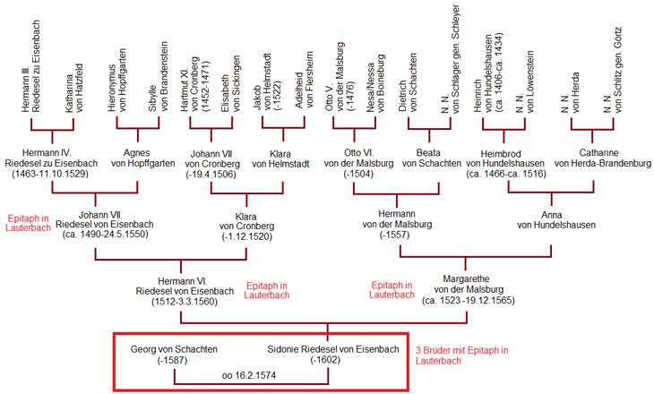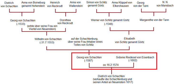Dazu paßt folgende Genealogie: Georgs Eltern waren Wilhelm von Schachten (- 31.7.1553) und Anna Elisabeth von Schlitz gen. von Görtz; ihre Wappen sehen wir außen an der Schachtenburg. Seine Großeltern waren väterlicherseits Georg von Schachten (-1533) und Dorothea von Reckrodt (Reckroth) sowie mütterlicherseits Werner von Schlitz gen. von Görtz (-1548), würzburgischer Rat und Reformator in Schlitz, und Margarethe von der Tann. Väterlicherseits waren die Urgroßeltern Dietrich von Schachten, Anna von Boineburg, Heinrich von Reckrodt und Anna von Wallenstein. Die Urgroßeltern mütterlicherseits waren Simon von Schlitz, Anna Klüppel von Elkershausen, Georg von der Tann sowie nach Literatur Maria Fuchs, was aber nicht zu dem Wappen Mansbach paßt, das wir hier am Epitaph sehen. Der Vorname der betreffenden Urgroßmutter ist nicht bekannt.