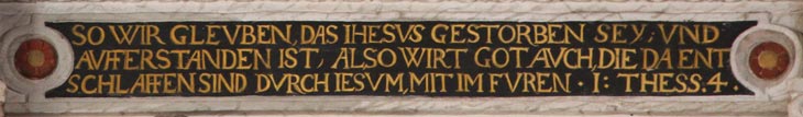 Die rechteckige, rechts und links ornamentbedingt eingepfropfte Inschrift über den Köpfen des Figurenpaares ist deutsch und lautet: "SO WIR GLEVBEN, DAS IHESVS GESTORBEN SEY, VND AUFFERSTANDEN IST, ALSO WIRT GOT AVCH DIE DA ENTSCHLAFFEN SIND DVRCH IESVM, MIT IM FVHREN. I: THESS.4:", also 1. Thessalonicher Kap. 4, Vers 14 in der lutherischen Übersetzung: Denn so wir glauben, daß Jesus gestorben und auferstanden ist, also wird Gott auch, die da entschlafen sind, durch Jesum mit ihm führen.