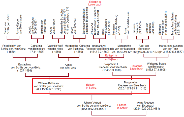 Und hier sei noch die Generation der Urgroßeltern gelistet: Auf der Seite des Wilhelm Balthasar von Schlitz gen. von Görtz waren das Simon von Schlitz gen. Görtz und Anna Klüppel von Elkershausen, Ludwig von Boineburg (1466-1537) und Mathilde von Hörda/Herda, Adam von der Hees und seine Frau, sowie Georg von Buchenau und Dorothea von Breidenbach gen. Breidenstein. Auf der Seite der Margarethe Riedesel von Eisenbach waren das Johann Riedesel von Eisenbach (-24.5.1550) und Klara von Cronberg (-1.12.1520), Hermann von der Malsburg (-1557) und seine Frau Anna von Hundelshausen, Hans von Berlepsch (-9.2.1535) und Beate von Ebeleben (-2.8.1569) sowie Eberhard von der Tann (4.9.1495-9.6.1574) und Maria Anna Schenk zu Schweinsberg (-8.8.1567).