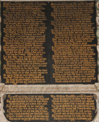 Der große, in zwei Spalten zu lesende Text des Hauptfeldes lautet: "Schau Mensch wie alles wird durch Tod u(nd) Zeit gefressen. / Gleich wie wir eingeschar(r)t, So bleiben wir vergessen. / Im fall nicht eine S(a)eul(e), und Schriftgegrabenen Stein. / Der Nach=welt Zeigen an, Wer wir gewesen sein. / Wer h(a)ett(e) es dir gesagt, Wen(n) nicht der Mundt der Zeiten. / Uns pflegte nach dem Todt, Ein Lob noch zubereiten / Das hi(e)r, wo Gottes Wort Leucht(et) als ein brennent Kertz(e). / Ruht Wilhelm Baltasar, von Schlitz genan(n)t von Görtz. / Der weiland Erbmarschall des Stiffts Fulda gewesen. / Nicht ohne gros(s)en ruhm, Der annoch wird gelesen / Am tag der Könige, kam er in diese Welt. / Als Fünfzehn Hundert man, und Acht und Sechzig z(a)ehlt / Nach Fünf vnd zwanzig Jahr, Bewarb sich seine Jugent / Umb Jungfrau Margareth, ein Ebenbilt der Tugend / Die ein(e) Riedeselin zu Eysenbach vom Stam(m) / Mit welcher er Ailff (11) Kind(er) durch Gottes segen bekam / Sechs Söhn(e) als den Herman(n) Eustachen, so gestorben / Als er durch vierzig Ernd der Tugent Ruhm erworben / Davon in Böhmen noch Wonsi(e)del redt und weis(s). / Das neben dem Cypress, ihm steckte Ehrenpreis. / Dar(a)uff Johann Volprechten, Der diese S(a)eulen setzen / Die Ehrgedächtnis schrifft Darin hat las(s)en ätzen / Und noch beym leben ist so lang es Gott gefäl(l)t / Nach dem kam Friedrich Wilhelm in diese welt / Ein tapfer(er) Kluger Mann Des leben abgeschnitten. / Nach Sieben Zwantzig Jahr Als fechtend er gestritten / In seiner Dapferkeit bey Leipzig in der Schlacht / Sein Grab und Ehrens(a)eul(e) hat Eusenburg gemacht / Ott(o) Hartmann war der vierdt, Den Gott in seiner würde / Stadhalter lies(s)e sein, Er legt(e) des lebens Bürde / Ab, als Er Fünftzig Jahr vnd Drey auf Erden schweb / Görg Sittich war der Fünft, Der auf der Welt noch lebt / So lang der Höchste wil(l), Darauf beschlos(s) die Zahl / Der Adolff Heinrich hies(s), Der als er Ach(t)zehn mahl / Die Som(m)er lüft geseh(e)n, Schlieff Er zu Marpurg ein / Die Musen hört man noch umb Ihn betrübet sein // Schau hier auch Leser ahn, Hier wird blos(s) abgemahlet / Was aus FrauMargareth von Gortz vorhin gestra(h)let / Hier ist kaum halberteil, Was dorten völlig gantz / Und Schatten was sonst war. Im leben lautter glantz / Ihre stille sit(t)zamkeit, Gab allen Zu erkennen. / Das(s) sie ni(ch)t anders sey, Als Margareth Zu nen(n)ennen / Wie Perlen an der Zucht, Wie Perlen an dem Ruhm / Wahr ihr Lebens ahrt, und schönstes Christentuhm / Und wie die Gottesforcht, alsbalt umb ihre wiegen / Wie Demuth vnd gedult, un(d) wissenheit zu kriegen. / Und lieb(e) ihr stets gefolgt, So hielten sie auch stand / Als ietz(t) die gläubig(e) Seel(e), Eilt in ihr Vatterland / Es z(a)ehlt die Christenwelt, gleich Sechzehn Hundert Jahr / Und Dreyzehn als ietz(t) Schlitz stund umb die Todtenbahr / Der hochbeliebten Frau, Die Tränen Zeigten an / Das(s) sie bey lebens Zeit, Hab allen gut(e)s gethan / Fünff Töchter gab ihr Gott, Im lieben Ehestants Seegen / Nach aber die Sechs Söhn(e), darunder war gelegen / Am Ersten in der Wieg Beata die herna(c)h / Trawt Ludwig Adolff Schwartz ihr him(m)elssehnend Ach / Hat Zwi(n)genberg gehört, und wi(e)der Antwortt geben / Betrübt das(s) sie nur sechs, nach Dreys(s)ig Jahr solt leben / Der folgte Clar(a) Angnes, Die weiland ward vertraut / Jörg Christoff Dieden, Den Erst Fürstenstein geschaud / Sie starb im wittbenstand zu Schlitz Als sie die Erden / Hat vier und fünfzig maht, sehen neu begrünet werden / Sidonia verblieb der Keuschheit Eigenthum / Fiel ab wie bey der nacht Die welcke Rosenblum(e) / Nachdem sie hat geprangt, Durch Zwey u(nd) Fünftzig lentzen / Die Seel(e) begrünet nun, im Paradies zu gläntzen / Frau Catharina die an den von Wallenstein / Vereh(e)licht weiland war, heis(s)t Gott noch Wittib sein / So lang es ihm beliebt. Als kaum des Mondes Licht / Dreymahl stund auff der Wacht, In vollem angesicht / Ging Hedewig die Fünfft, schon wieder aus der welt / Dan(n) ihre wohnu(n)g wurd, Im Himmel war bestel(l)t".