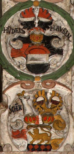 Optisch links daneben befindet sich das Wappen der von der Hees; es zeigt in Rot einen silbernen Balken, oben von zwei silbernen Mühleisen begleitet (hier kaum der Form nach zu erkennen), auf dem Helm mit rot-silbernen Decken der Schild angestemmt zwischen zwei roten, je mit einem silbernen Balken belegten Büffelhörnern (Westfälisches Wappenbuch, Aschaffenburger Wappenbuch, Rietstap, Siebmacher Band: NaA Seite: 25 Tafel: 38). Das Stammhaus Hees ist heute unter dem Namen Junkernhees im Kreis Siegen bekannt.