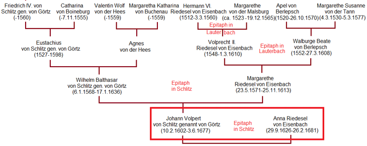 Die Eltern von Johann Volpert von Schlitz genannt von Görtz waren Wilhelm Balthasar von Schlitz gen. von Görtz (6.1.1568-17.1.1636) und Margarethe Riedesel von Eisenbach (23.5.1571-25.11.1613), wobei deren Epitaph im vorangegangenen Artikel beschrieben wurde. Die Großeltern waren: Eustachius von Schlitz gen. von Görtz (1527-1598) und Agnes von der Hees väterlicherseits und Volprecht II. Riedesel von Eisenbach (1548-1.3.1610) und Walburge Beate von Berlepsch (1552-27.3.1608) mütterlicherseits. Hier gibt es in der Stadtkirche Lauterbach ein korrespondierendes Doppelepitaph für die Großeltern mütterlicherseits, aber ohne Wappen.