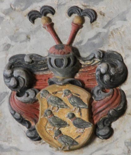 Danach setzt sich die Ahnenprobe des Ehemannes auf der optisch linken Vertikalen mit sechs Wappen fort, beginnend mit dem Wappen der von der Hees, in Rot ein silberner Balken, oben von zwei silbernen Mühleisen begleitet), auf dem Helm mit rot-silbernen Decken der Schild angestemmt zwischen zwei roten, je mit einem silbernen Balken belegten Büffelhörnern (Westfälisches Wappenbuch, Aschaffenburger Wappenbuch, Rietstap, Siebmacher Band: NaA Seite: 25 Tafel: 38). Das Wappen steht hier für die Großmutter Agnes von der Hees und den Urgroßvater Valentin Wolf von der Hees (-1559). Darunter folgt das Wappen der von Berlepsch (unten besser zu sehen, denn es taucht zweimal an diesem Epitaph auf) für die Großmutter Walburge Beate von Berlepsch (1552-27.3.1608) und den Urgroßvater Apel von Berlepsch (1520-26.10.1570).