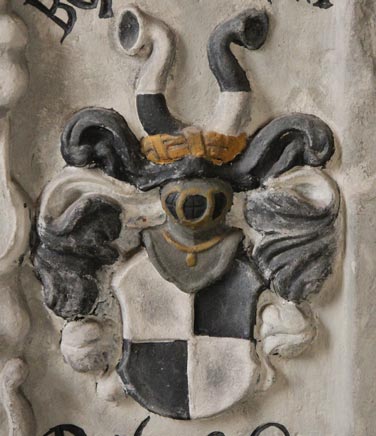 Das breite Gebälk über dem Zentralfeld und die beiden seitlichen Wandvorlagen tragen zusammen die Ahnenprobe beider Ehepartner, vier in der Horizontalen und zweimal vier in der Vertikalen, was eine 8er-Ahnenprobe für jeden Partner ergibt. Die Ahnenprobe beginnt jeweils in der Mitte, läuft mit abnehmender Wichtigkeit und nachrangiger Position in der Ahnentafel zunächst horizontal nach außen und dann den Rand entlang nach unten. Entsprechend finden wir in der Horizontalen jeweils elterliche Wappen und auf der Seite in der Vertikalen oben die beiden in der Großelterngeneration hinzukommenden Wappen und unten die vier in der Urgroßelterngeneration hinzukommenden Wappen. Mehrere Familien kommen aufgrund der engen Versippung regional benachbarter Familien mehrfach vor.