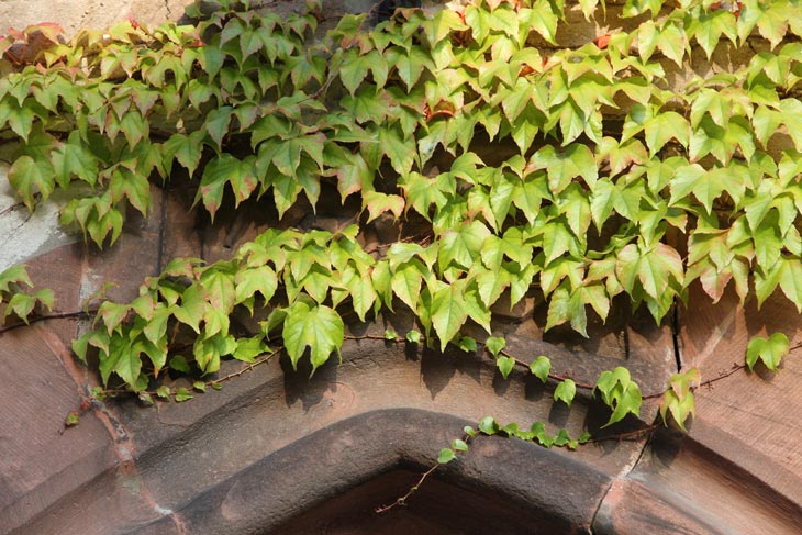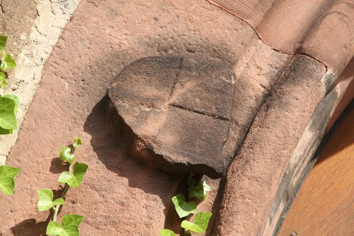 Update: Hier wurde gehandelt, großes Lob! Mittlerweile (Mai 2018) ist der Wilde Wein sorgfältig entfernt, und das Wappenrelief liegt wieder frei (der Schatten in der Abb. stammt von der Laterne). Man erkennt heraldisch rechts das Wappen der von Elkershausen gen. Klüppel, in Rot drei (2:1) aufrechte silberne Beile mit schwarzem Stiel, und heraldisch links das Wappen der der von Schlitz genannt Görtz, in Silber zwei schwarze, schrägrechte, oben dreimal gezinnte Balken (Zinnenschrägbalken). Eigentlich müßten die beiden Wappen genau andersherum angeordnet sein, um der Ehe zwischen Ludwig von Schlitz gen. Görtz und Gutha von Elkershausen gen. Klüppel zu entsprechen.