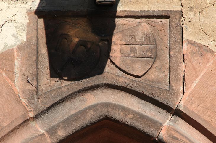 Von heraldischem Interesse ist lediglich das spitzbogige Portal mit Kehle und Rundstab in der Mitte der Hoffront des östlichen Wohngebäudes. Auf dem Schlußstein ist ein Allianzwappen aus zwei Schilden angebracht (Abb. oben), das aber noch 2016 völlig von Wildem Wein überwuchert war, dessen Haftnäpfe den oberflächlich angegriffenen Sandstein überzogen. Das Relief dieser beiden Wappensteine war durch den Bewuchs bedroht, hier bestand Handlungsbedarf wie übrigens an der gesamten Hinterburg.