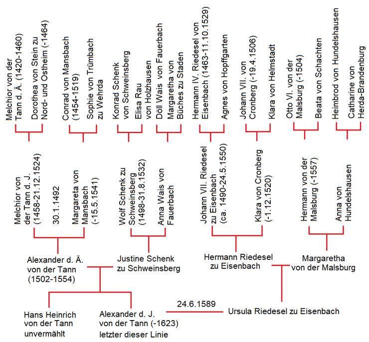 Die Großeltern der beiden Brüder waren Melchior von der Tann d. J. (1458-21.12.1524), fuldischer Amtmann zu Haselstein und Bach (Vacha), und dessen Frau Margareta von Mansbach (-15.5.1541) väterlicherseits sowie Wolf Schenk zu Schweinsberg (1498-31.8.1532) und Anna Wais von Fauerbach (-16.4.1564) mütterlicherseits. Die Urgroßeltern der beiden Brüder waren väterlicherseits Melchior von der Tann d. Ä. (1420-1460), Amtmann zu Lichtenberg, Dorothea von Stein zu Nord- und Ostheim, Conrad von Mansbach (1454-1519) und Sophie von Trümbach zu Wehrda. Mütterlicherseits waren die Urgroßeltern Conrad Schenk von Schweinsberg (1459-1.3.1497), Amtmann zu Lich, seine Frau Elisa Rau von Holzhausen (-19.9.1503), Tholde (Döll) Wais von Fauerbach und dessen Frau, Margarethe von Büches (Buches).