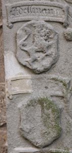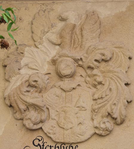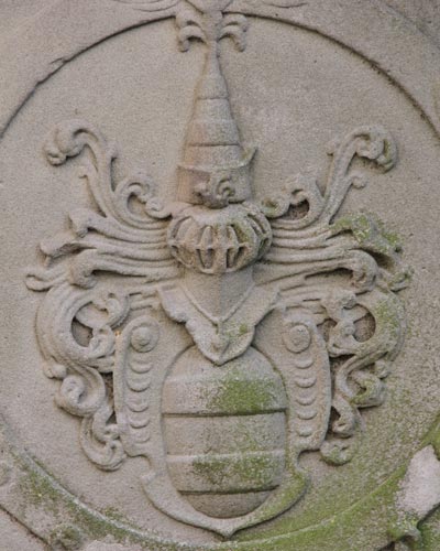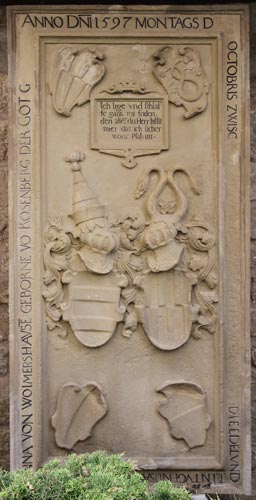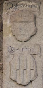 Hans Conrad von Wollmershausen (1576-21.2.1640) war seit dem Jahr 1600 mit Amalia Rosina Truchseß von Pommersfelden (1579-1638) verheiratet. Dem entspricht das zentrale Ehewappen, rechts von Wollmershausen (in Rot zwei silberne Balken, auf dem Helm mit rot-silbernen Decken ein silbern oder mit Hermelin gestulpter roter Spitzhut, mit zwei silbernen Balken belegt, oben mit einem schwarzen Hahnenfederbusch besteckt), links Truchseß von Pommersfelden (in Silber ein blauer, rotgezungter, golden gekrönter und ebenso bewehrter Löwe, überdeckt von zwei roten Balken, auf dem Helm mit blau-silbernen Decken der Löwe wachsend, überdeckt von zwei roten Balken - hier nur ein Balken in der Helmzier).