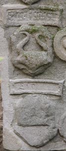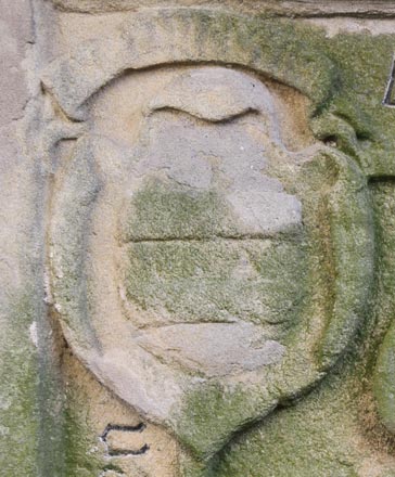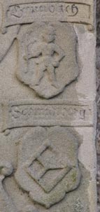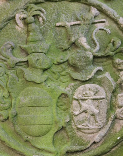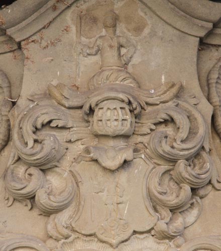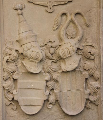 Die Wappenschilde auf der heraldisch rechten Seite sind entsprechend der üblichen Logik von oben nach unten: