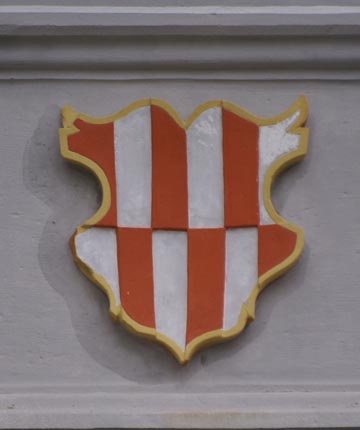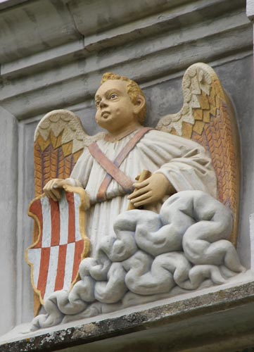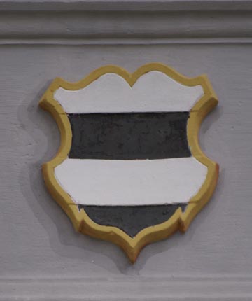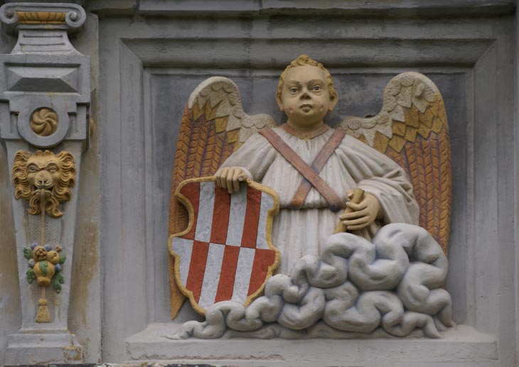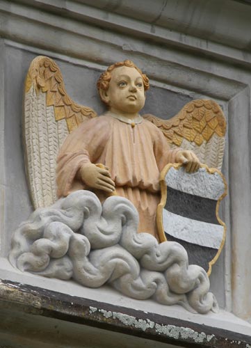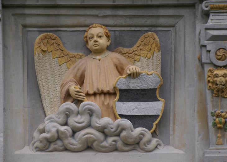 Die beiden Wappen des Bauherren sehen wir feldseitig in den Feldern der Brüstung unterhalb des Doppelfensters. Beide Schilde werden von aus Wolken hervorkommenden Engeln gehalten, die zu den großartigsten Schildhaltern in Schwaben gehören. Albrecht von Liebenstein führt einen dreimal silbern-schwarz geteilten Schild (Abb. oben). Der hier nicht dargestellte Helm trüge zu schwarz-silbernen Decken ein dreimal silbern-schwarz geteiltes Paar Büffelhörner. Das Wappen wird beschrieben im Aschaffenburger Wappenbuch, Tafel 6 Seite 53, und im Band: WüA Seite: 98 Tafel: 56.