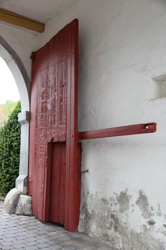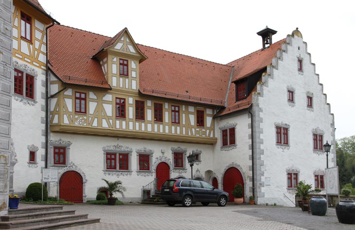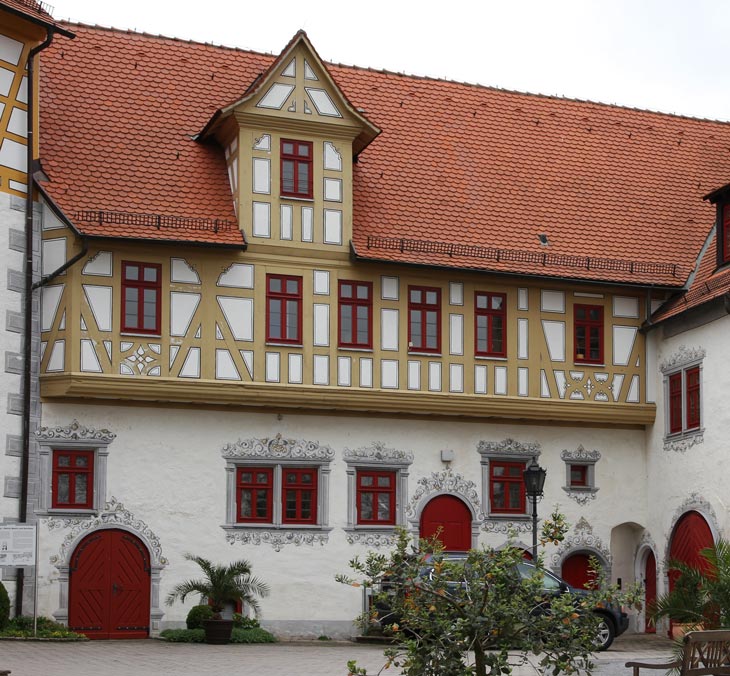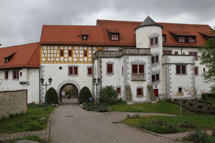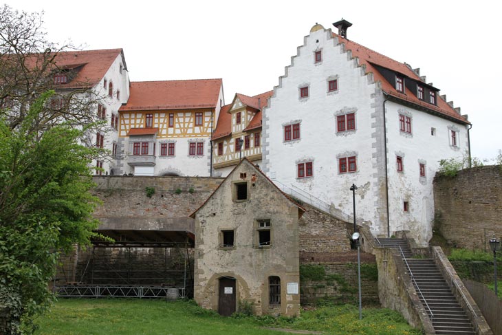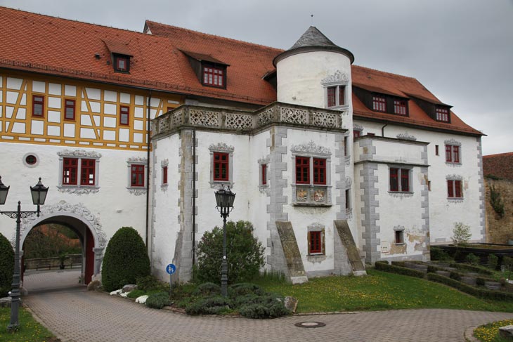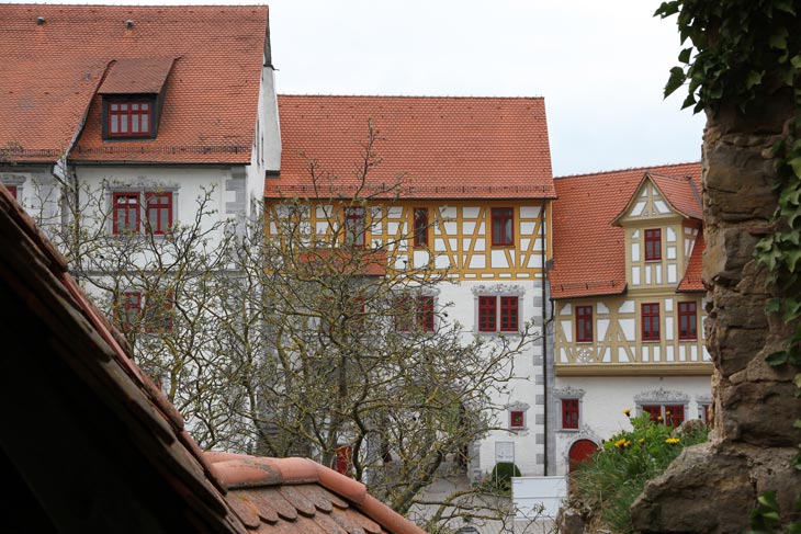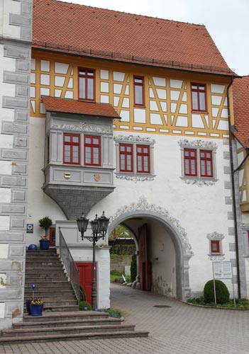 Der Rundgang schließt sich mit dem letzten Gebäude, dem Wasch- und Backhaus, das die Lücke zwischen Reiterhaus und Torhaus schließt (oben im Bild). Es entstand im ersten Viertel des 17. Jh. und war eines der letzten Projekte des großen Renaissance-Umbaus. Die Eingänge sind rund- oder stichbogig. Die Fenster sind mit Hohlkehlen profiliert. Hofseitig wurde Fachwerk für das erste Obergeschoß und das Zwerchhaus verwendet.
