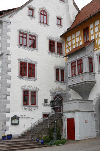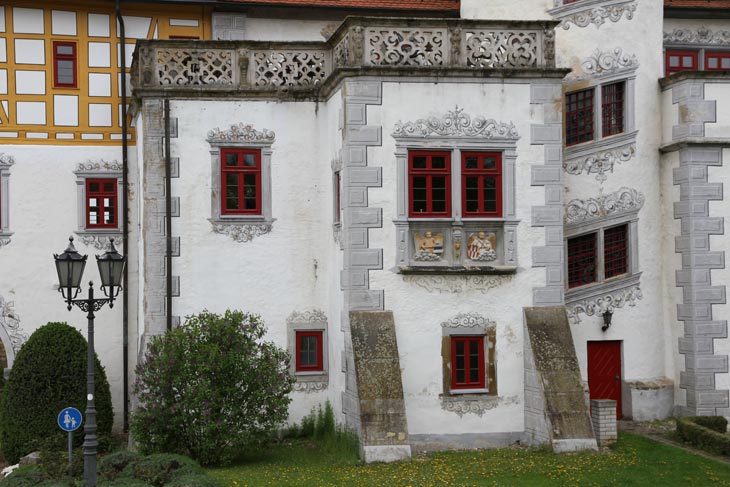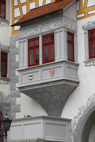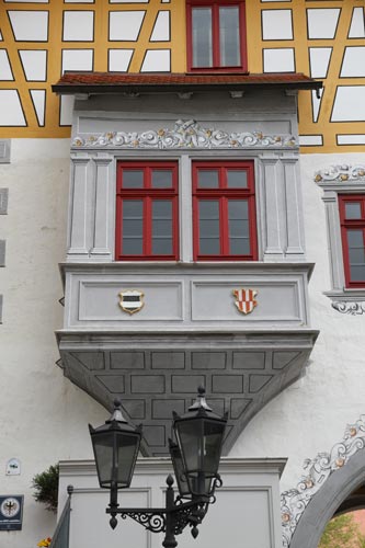 Auf der Innenseite besitzt das Torhaus links (nordöstlich) der Durchfahrt einen Erker in Höhe des ersten Obergeschosses (beide Abb. oben). Auf der Brüstung unter den beiden beiderseits von Zwillingspilastern gerahmten Fenstern sind zwei Wappenschilde angebracht (beide Abb. unten), heraldisch rechts der für Albrecht von Liebenstein (1555-1608), dreimal silbern-schwarz geteilt, heraldisch links der für seine Frau, Margaretha von Rosenberg, rot-silbern geteilt und fünfmal gespalten. Die Jahreszahl 1620 lesen wir auf einem kleinen Anbau unterhalb des Erkers auf dem Türsturz, vermutlich eine der letzten Baumaßnahmen der großen Umgestaltung und Schloßwerdung. Direkt daneben führt eine unlängst aufwendig renovierte Treppenanlage zum Eingang in das Obere Schloß.