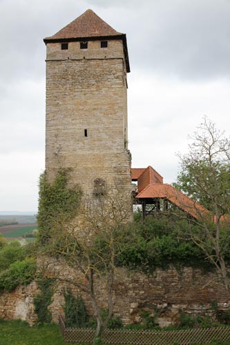 Der viereckige, spätromanische Bergfried (beide Abb. oben) dieser ersten Burg ist noch erhalten, aber trotz Restaurierung im Jahr 1987 aktuell in schlechtem Zustand. Er wurde notsaniert, muß aber dringend in nächster Zeit tiefgreifend saniert werden; derzeit kann man ihn nicht mehr besteigen. Der schlichte und ohne jede Stilelemente archaisch wirkende Bergfried aus Muschelkalkblöcken, dessen rundbogiger Eingang in 6,50 m Höhe liegt, wird oben über den Zinnen mit einem Zeltdach abgeschlossen. Bis zur Wehrplattform ist er 21,50 m hoch, bis zur Dachspitze 29 m. 110 Stufen führen hinauf. Die Außenkanten sind 8-9 m lang, das Mauerwerk über 2 m dick. Der Raum auf dem Eingangsniveau ruht auf einem Stichkappengewölbe des hohen Untergeschosses, der einzigen steinernen Decke im Turm. Darüber unterteilten lediglich Holzbalkendecken die drei Wohngeschosse, ganz oben liegt die Wehrplattform. Das Eingangsgeschoß besaß einen Abort (Reste des Aborterkers sind außen zu sehen, vgl. Abb. links), einen Kamin und ein heute vermauertes größeres Fenster. Dieser Raum war also für kurzfristige Nutzung als Not-Wohnraum vorgesehen, doch der Kamin ist offensichtlich mangels Belagerung nie benutzt worden. Die Brustwehr mit Zinnen über einem schlichten Außengesims ist noch original. Der Dachansatz eines späteren, aber wieder abgerissenen Wohngebäudes ist noch als Spur am Bergfried zu erkennen (Abb. oben rechts).