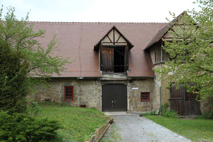 Nordöstlich schloß früher an das Hauptgebäude das Meierhaus des Oberen Schlosses an; dieses Gebäude ist abgegangen. Weiter im Nordosten liegt die riesige Zehntscheune (Abb. oben) aus der zweiten Hälfte des 16. Jh. mit drei großen Scheunentoren. Sie gehört noch zum Oberen Schloß, das aber mit diesem Gebäude seinen östlichen Abschluß findet. Die Dimensionen sind gewaltig: Der Dachfirst liegt in 16,50 m Höhe, die Grundfläche beträgt 440 m2. Eine genaue Datierung findet man an einem bogenförmigen Stein: Die Jahreszahl 1557 ist kombiniert mit den Wappen für Moritz von Liebenstein und Barbara Stiebar von Buttenheim (ohne Abb.). Ein zweistöckiger Anbau wurde später an die Westecke angebaut (links im obigen Bild), stilistisch mit dem Reiterhaus (s. u.) verwandt, wie man am Vergleich der Treppengiebel mit Muschelornamenten sieht, und daher auch in die gleiche Zeit einzuordnen. Vielfache Umbauten haben das ursprüngliche Aussehen verändert.
