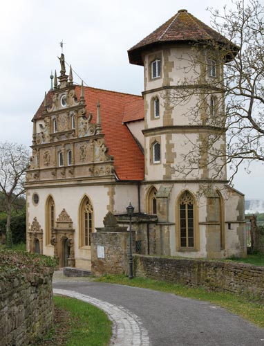 Bauherr dieses Umbaus war ebenfalls wie am Torhaus Albrecht von Liebenstein (1555-25.7.1608), vermählt mit Margaretha von Rosenberg (-1616). Albrecht von Liebenstein war der Sohn von Bernhard von Liebenstein (-22.3.1596), 1579-1580 württembergischer Hofmarschall, 1580-1584 Obervogt zu Vaihingen und bis 1592 zu Lauffen, und dessen Frau, Margaretha von Hutten (-1.12.1610). Albrecht stand ab 1581 in württembergischen Diensten, wurde 1592 in Nachfolge seines Vaters Obervogt zu Lauffen und 1595 der erste württembergische Obervogt zu Besigheim und Mundelsheim, nachdem dieses bis dahin badische Amt an Württemberg gekommen war. Albrechts Großeltern väterlicherseits waren Moritz von Liebenstein (-25.4.1589), Sohn von Peter von Liebenstein und dessen zweiter Frau, Veronica von Schaumberg, kaiserlicher Feldoberster und Lieutenant und in württembergischen Diensten als Obervogt zu Beilstein und Vaihingen a. d. Enz, und Barbara Stiebar von Buttenheim. Albrechts Großeltern mütterlicherseits waren Esrom von Hutten zu Michelfeld und Katharina Zobel von Giebelstadt, Tochter des Jörg Zobel von Giebelstadt und Dorothea Rüdt von Collenberg. Übrigens war es Bernhard von Liebenstein, der mit dem Bau der Schloßkapelle begann, und Albrecht von Liebenstein, unter dem sie vollendet wurde.