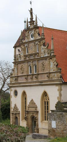 Wenn man weiter entgegen dem Uhrzeigersinn der Ringmauer folgt, kommt man an Stellen vorbei, an denen sich früher die mittlerweile abgegangene Untere Meierscheuer und die Amtsscheuer befanden. Am Kirchgarten vorbei kommt man zur Schloßkapelle (beide Abb. oben), der ein eigenes Kapitel gewidmet ist (siehe dort). Dahinter, schon nahe der Kernburg, befanden sich weitere Gebäude, die heute verschwunden sind.