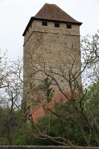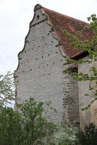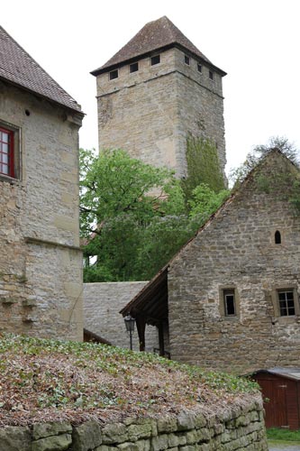 Dahinter im äußersten östlichen Eck der Ringmauer liegen die um 1600 entstandenen Wirtschaftsbauten des Unteren Schlosses, das Alte Bandhaus (= Küferei) und die Heuscheuer mit Fruchtkasten (beide Abb. oben). Diese Gebäude entstanden in der Renaissance und besitzen hohe Schweifgiebel und zweistöckige Gauben. Unter der gesamten L-förmigen Grundfläche liegt ein 5 m hoher Weinkeller mit Tonnengewölbe. Nicht mehr von außen zu erkennen ist, daß in der Ostecke die bis zu 11 m hohen Außenmauern eines spätromanischen Turmes von 5,60 m x 5,80 m Grundfläche verbaut worden sind. Er war einst dreiseitig und hinten offen, so daß bei der Zweitverwertung nur eine Wand abgerissen werden mußte.
