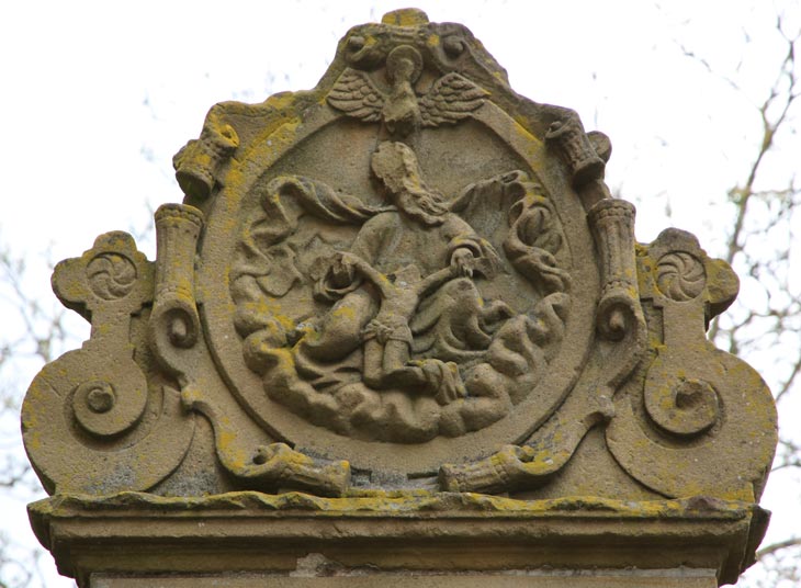 Weiterhin sieht man in der Nähe der Schloßkapelle eine Rollwerkkartusche mit einem Relief, das die Trinitas darstellt, Gott Vater holt in Wolken schwebend den vom Kreuz Abgenommenen zu sich, während über ihm die Taube des Heiligen Geists schwebt.