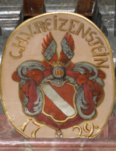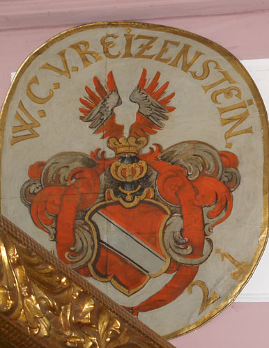 Abb. rechts oben: Tafel 72: Position ganz links, Aufschwörschild für "W. C. V. REIZENSTEIN" = Wolff Christoph von Reitzenstein (14.11.1663-17.1.1729), datiert auf 1721. Wappenbeschreibung siehe weiter oben auf dieser Seite. Wolff Christoph von Reitzenstein auf Zoppaten (Biedermann Voigtland Tafel 73) war der Sohn von Christoph Friedrich von Reitzenstein auf Krötenhof, dem Stammherrn der Linie zu Zoppaten. Der Vater war Cornet in schwedischen Diensten. Die Mutter war Maria Juliana von Kotzau. Wolff Christoph von Reitzenstein wurde fürstlich-bayreuthischer Geheimer Rat, Oberforstmeister und Oberjägermeister. Er heiratete 1707 Maria Sabina von Würtzburg (21.3.1683-17.6.1762), die Tochter von Johann Veit von Würtzburg (21.12.1638-7.4.1703) zu Ober- und Untermitwitz und Cordula von Redwitz-Wildenroth (-7.2.1696). Er liegt in der Kirche von Zoppaten begraben.