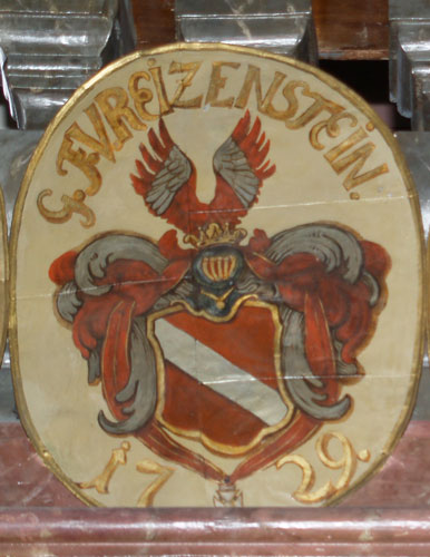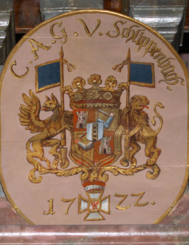 2.) Christopher von Schlippenbach bekam am 28.2.1711 zu Barcelona ein königlich-spanisches Grafendiplom, und das ist die Form des Wappens, wie wir sie hier in der Ordenskirche sehen: Geviert mit Herzschild, Feld 1 und 4: ein Turm, Feld 2 und 3: ein aus dem linken Schildrand hervorkommender, geharnischter, säbelschwingender Arm, Herzschild: in Schwarz eine silberne pfahlweise gelegte Kette aus drei ganzen und zwei halben Ringen. Auf dem Schild ruht die gräfliche Blattkrone. Als Schildhalter wird rechts ein Greif, links ein Löwe verwendet, beide widersehend, jeder ein Banner haltend, darauf ein gekrönter Helm, besteckt mit einer hängenden Kette. Soweit die Beschreibung nach Stavenhagen. Hier gibt es einige farbliche Abweichungen, am offensichtlichsten beim Herzschild, auch gibt es Unterschiede in der exakten Stellung des geharnischten Armes; hier kommen beide aus dem inneren Rand, der obere nach links, der untere nach rechts. Diese Form des Wappens taucht weder im Rietstap, noch bei Spießen noch im Siebmacher auf.