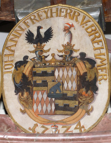 Abb. rechts oben: Tafel 64: Position Mitte links, Aufschwörschild für "IOHANN FREYHERR V: BREHMER" = Johann Freiherr von Brehmer (27.4.1677-30.6.1754), datiert auf 1724. Blasonierung: Geviert, Feld 1 und 4: hier in Gold zwei schwarze, oben gezinnte Balken (eigentlich müßte es umgekehrt sein, in Schwarz zwei goldene, oben gezinnte Balken), Feld 2 und 3: rot-silbern gerautet, Herzschild: hier undefinierbar (in Gold ein linksgekehrter Bär?). Nach Siebmacher, wo auch der Hauptschild abweichend abgebildet ist, Herzschild: in Gold ein schwarzer Sparren, begleitet von drei (2:1) schwarzen Adlerköpfen. Dazu werden zwei gekrönte Helme geführt, Helm 1 (rechts): ein wachsender schwarzer Adler, Helm 2 (links): ein wachsender, silbern gekleideter Mannesrumpf mit einer silbern-roten Mütze auf dem Kopf, Decken hier beidseitig schwarz-golden. Siebmacher abweichend, Helmzier 2 mit rot-golden geschachter Kleidung, Decken rechts schwarz-golden, links rot-silbern. Nachweis: Siebmacher Band: BayA1 Seite: 130 Tafel: 136. Das Wappen wurde später mit dem der Wrangel vereinigt als Wrangel von Brehmer, wobei dem Brehmer-Hauptschild das Wrangel-Stammwappen (in Silber ein schwarzer, oben gezinnter Balken) aufgelegt wurde.