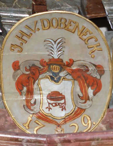 Abb. links oben: Tafel 61: dritte Position von rechts, Aufschwörschild für "J. H. V. DOBENECK" = Johann Heinrich von Dobeneck (21.12.1699-1759), datiert auf 1729. Blasonierung: In Silber ein roter, runder, breitkrempiger Klerikerhut, von dem 2 verschlungene Schnüre mit Quasten herabhängen, auf dem Helm mit rot-silbernen Decken der gleiche rote Hut, aber ohne Schnüre, darauf ein Busch von zehn silbernen Hahnenfedern. Nachweis: Siebmacher Band: SchwA Seite: 8 Tafel: 5. Alter Siebmacher von 1605. Rietstap: "D'argent à un chapeau de protonotaire de gueules. Cimier le chapeau sans cordons ni houppes, sommé de dix plumes de coq d'argent".