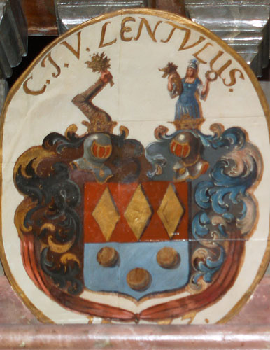 Abb. rechts oben: Tafel 66: dritte Position von links, Aufschwörschild für "C. J. V. LENTVLUS" = Cäsar Joseph von Lentulus (ca. 7.6.1683-21./29.5.1744), datiert auf 1722. Blasonierung: Geteilt, oben in Rot drei goldene Rauten nebeneinander, unten in Blau drei (2:1) goldene Kugeln. Zwei gekrönte Helme: Helm 1 (rechts): zu schwarz-goldenen Decken ein wachsender, goldener gerüsteter Arm mit einem Strauß in der bloßen Hand, Helm 2 (links): zu blau-silbernen Decken eine wachsende, blau gewandete Göttin Minerva mit federgeschmücktem Helm, in der Rechten ein goldenes Füllhorn haltend, in der Linken einen grünen Sieges-Lorbeerkranz. Nachweis: Siebmacher Band: Pr Seite: 52 Tafel: 66 (unzutreffende Farben), Band: SaA Seite: 97 Tafel: 62 mit dem hiesigen Bild entsprechenden Farben im Schild, die Kugeln als Linsen bezeichnet. Rietstap: "Coupé, au 1 de sable à trois fusées d'or rangées en fasce, au 2 d'azur à trois boules d'argent 2 et 1. Cimier une Minerve issante habillée d'azur et d'une veste d'or, coiffée d'un casque d'azur liséré d'or la visière levée, panaché de trois plumes d'autruche une d'azur entre deux d'argent, tenant de sa main dextre une couronne de laurier de sinople et de sa senestre une corne d'abondance d'or remplie de fleurs et de fruits. Lambrequin d'argent et d'azur." Auch im Rietstap also die schwarze Farbe anstelle der roten, und nur eine Helmzier.