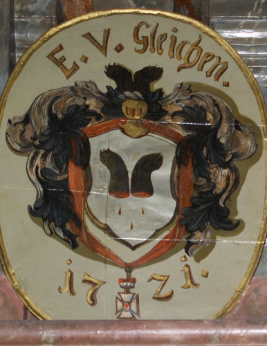 Abb. rechts oben: Tafel 68: Position ganz links, Aufschwörschild für "E. V. Gleichen" = Ernst von Gleichen jun. (-1761), datiert auf 1721. Blasonierung: In Silber zwei aufgereckte schwarze, rot bewehrte Bärenpranken (Bärentatzen), an den Schnittflächen rot, auf dem schwarz-silbern bewulsteten Helm mit ebensolchen Decken zwei aufgereckte schwarze, rot bewehrte Bärenpranken (Bärentatzen). Nachweis: Siebmacher Band: PrE Seite: 83 Tafel: 70, Aschaffenburger Wappenbuch Tafel 48 Seite 154. Rietstap: "D'argent à deux pattes d'ours adossées de sable. Casque couronné. Cimier les meubles de l'écu."